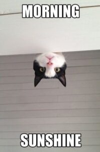 There is no sleeping in when a cat is hungry. The progression of aggressiveness is deliberate and tends to work every time! Stage 1: First is the gentle purr, but this usually has adverse effects on the sleeping humans. They are drifting off again…Hmmm, not working. Stage 2: How about a wet nose gently rubbing into the human’s nose? Nope, just makes the people swat at the cat. If they move their hand slowly, the cat can also be crafty enough to slide a body under the person’s hand for some much needed petting. Petting also leads to adverse effects of lowering blood pressure and soothing, not working. Time to get more aggressive. Stage 3: Desperate times call for desperate measures. It is a fact that most people have a full bladder in the morning. How about a nice bladder massage? If a cat puts their mind to it, they have a magical power of making a 10-pound body feel like fifty pounds of pressure. Ah ha! Starting to move. Success! The person is up and moving to the bathroom. The cat signal goes out to the other felines in the house…I repeat, human is awake and moving to bathroom.