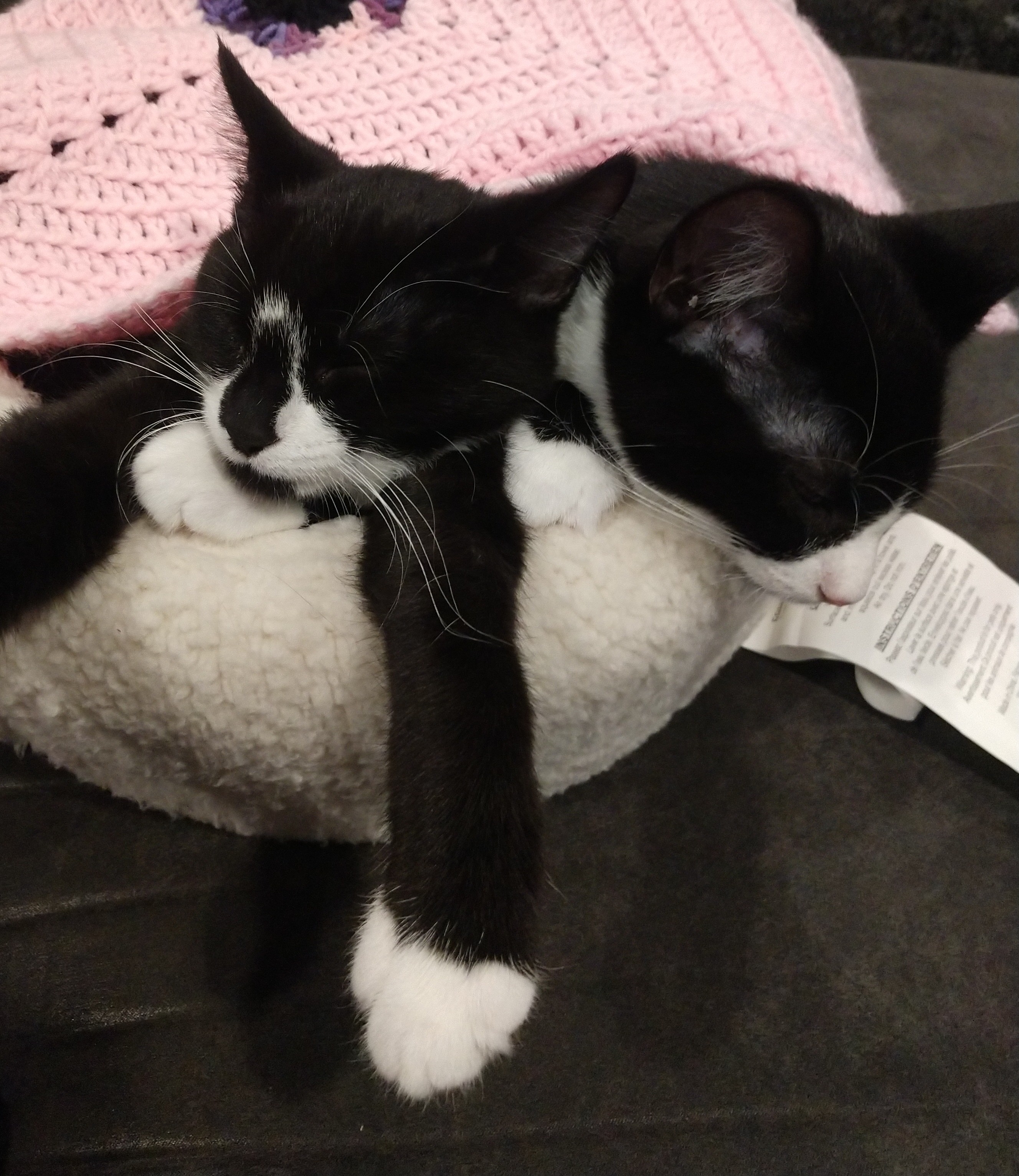 On New Year’s Eve 2020, Conan waited for our family to get home from a trip before he passed away. They are connected to us and us to them. His brother, Beamer, was heartbroken, so we recently adopted two tuxedo kittens. Emily and Domino (AKA Emi Lou and D…funny how they get their own nicknames eventually) Beamer at the ripe old age of 16 1/2 is hard of hearing, apparently has dementia, and is going with the flow. He’s basically a pissed off old man.